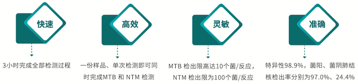 采用双重实时荧光PCR技术和TaqMan探针技术实现对结核分枝杆菌(MTB)和非结核分枝杆菌(NTM)的区分检测。 该试剂盒是现在国内唯一取得CFDA认证的可以快速区分结核分枝杆菌和非结核分枝杆菌感染的PCR产品。